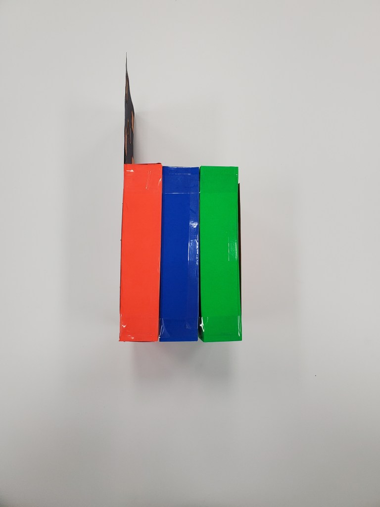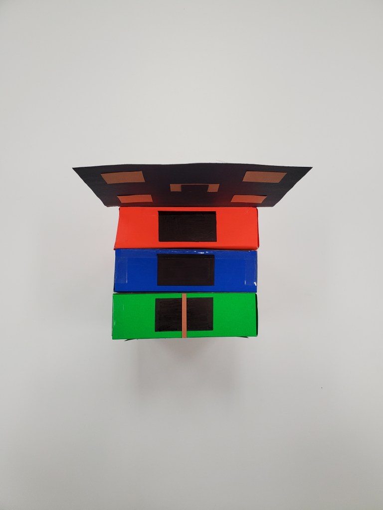 We used an old cardboard box as an outline/guidelines for the card stock, to make two more bins. Construction paper was used to make our facts sheet and labels. We used double sided tape to piece it all together.