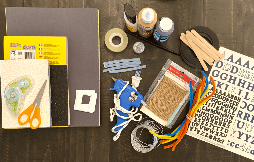 Making our waste bin, we used card stock, an old cardboard box, tape, construction paper and pens and markers.