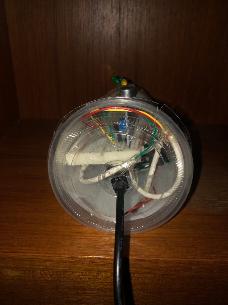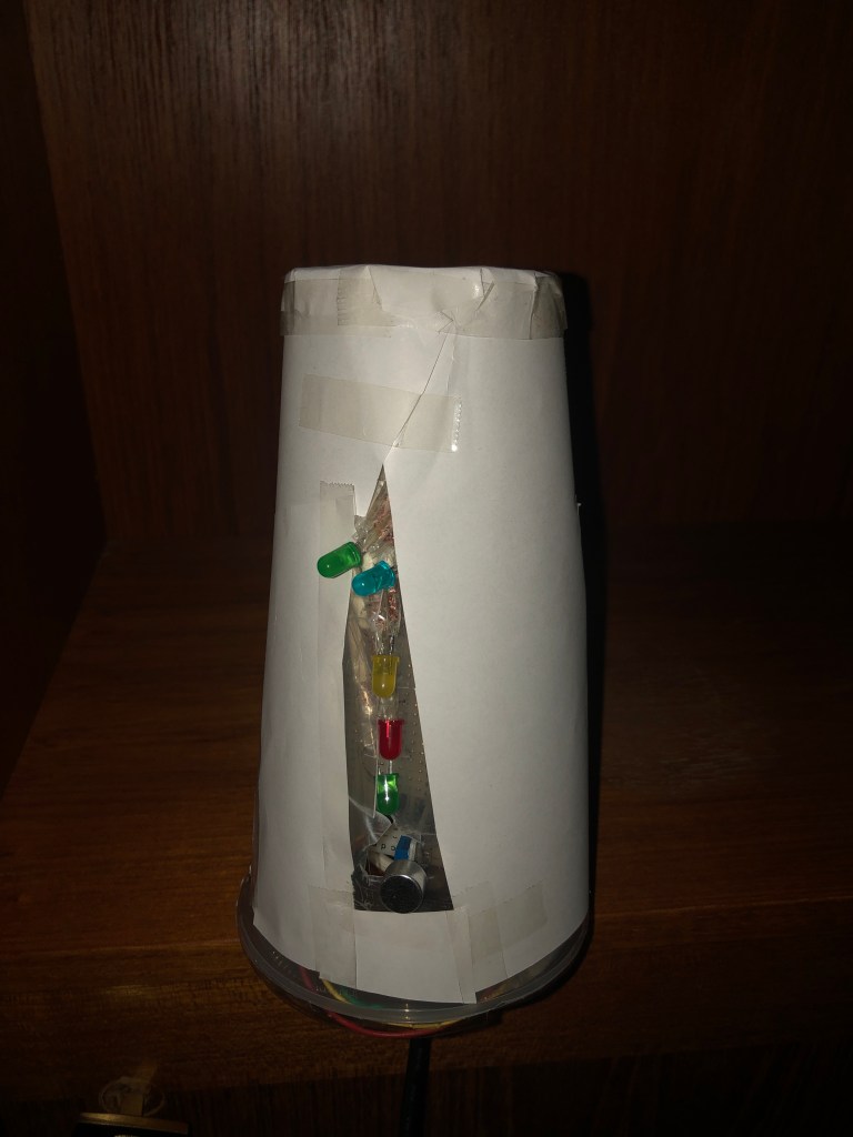 We placed all the electrical components inside the cup and poked the LEDs and sensor through their holes, and closed the cup with its lid and taped paper around the structure to ensure the Arduino and wires were covered from the outside.