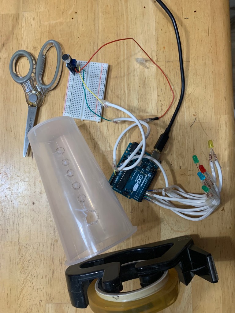 For the working light and sound sensor electronics we used: The Ardunio UNO, a Breadboard, 5 individual LEDs, a sound intensity sensor, and wires.